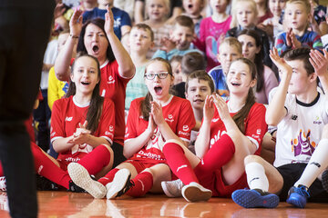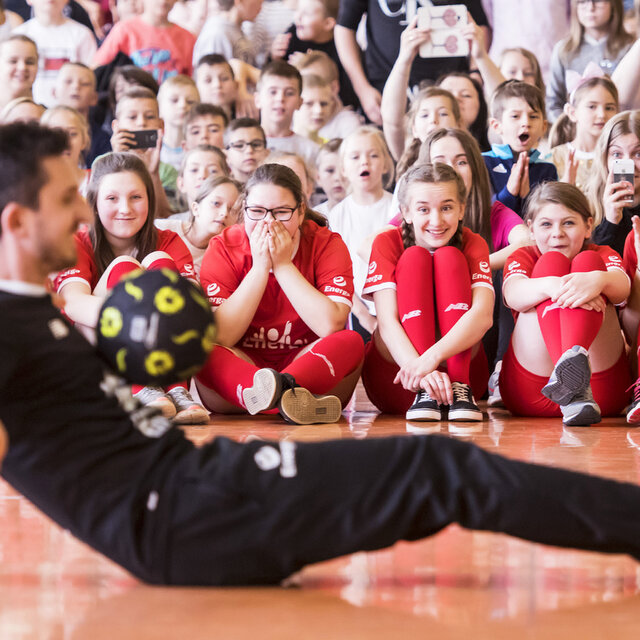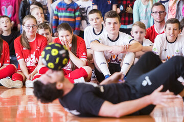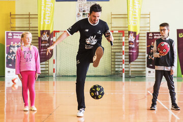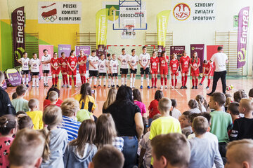 W piątkowe przedpołudnie sala gimnastyczna w Mrocznie była chyba najbardziej energetycznym miejscem pod słońcem. Uwielbiani przez najmłodszych ambasadorzy opowiedzieli o swoich sportowych początkach, wykonali pokazowe ćwiczenia i przeprowadzili rozgrzewkę dla całej szkoły.
