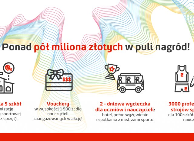 Aż 100 wyróżnionych placówek otrzyma łącznie 3000 kompletów profesjonalnej odzieży sportowej oraz 300 sportowych bluz dla nauczycieli.